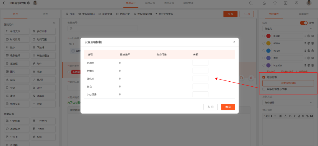 可以通过「选项份额」对选项进行有次数限额的设置,从而更好地满足企业的业务需求。