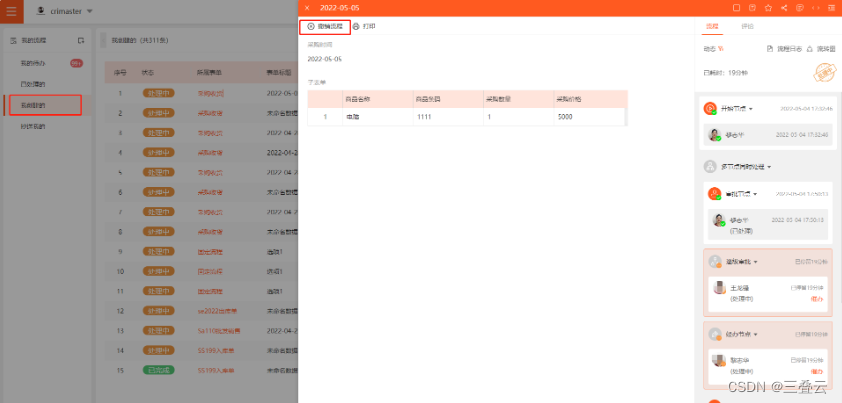 发起后,可在我创建的流程列表中,对某个流程进行【撤销流程】,撤销后的流程视为已结束,流程状态为“已撤销”,不能再审批。(能否撤销流程具体根据该流程表单的流程设置)