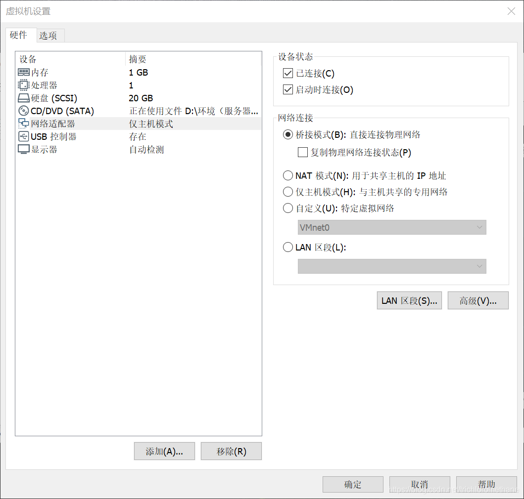 1、虚拟机网络连接模式为仅主机模式