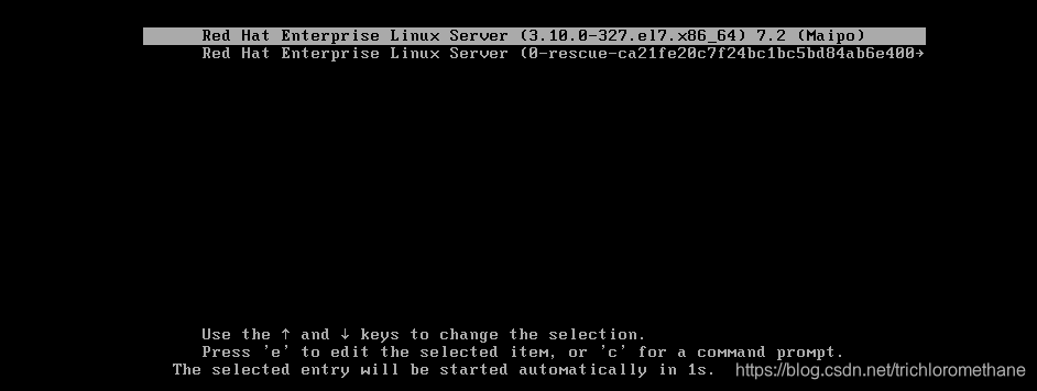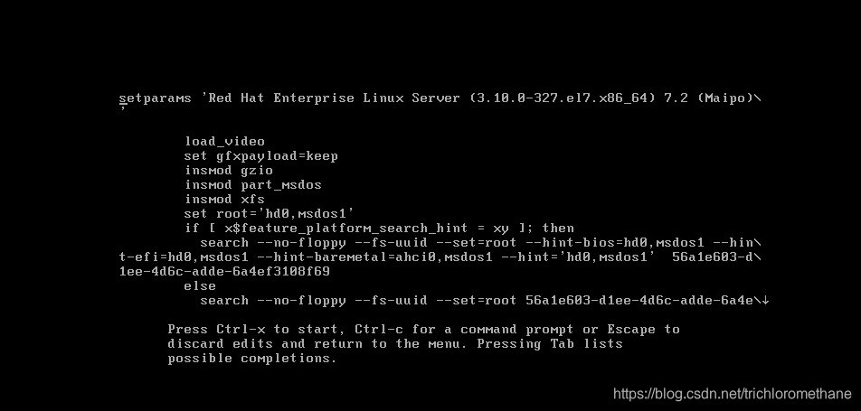 3、进入如下界面。用上下键移动到 开头为 “linux16 ”一行的最后输入“rd.break ”,ctrl+X 继续进行操作