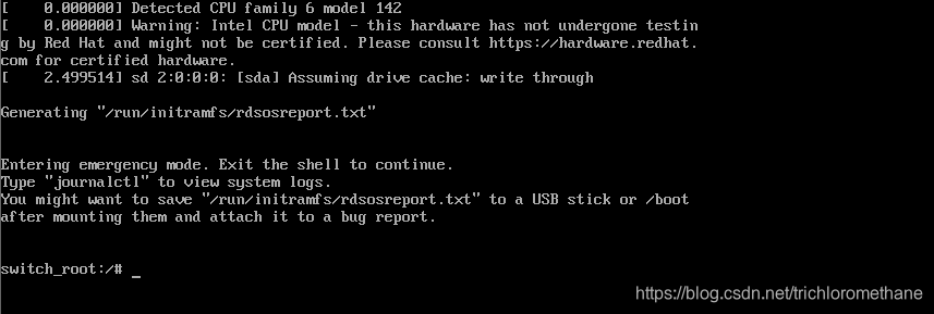 4、进入如下界面。出现提示符后输入“mount -o remount,rw /sysroot ”