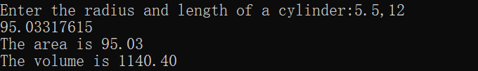 radius,length=eval(input("Enter the radius and length of a cylinder:"))