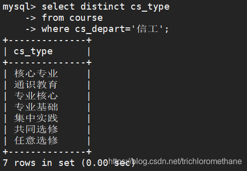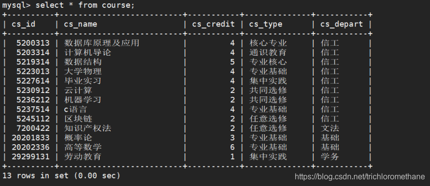 `cs_type` char(12) DEFAULT NULL COMMENT '课程类别',