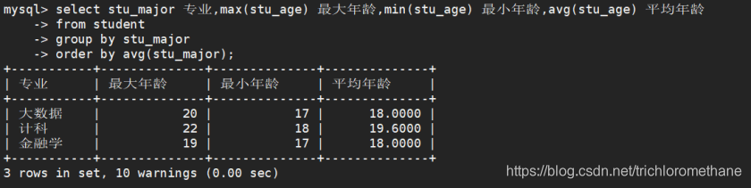 mysql> select stu_major 专业,max(stu_age) 最大年龄,min(stu_age) 最小年龄,avg(stu_age) 平均年龄