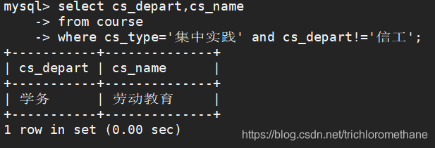 -> where cs_depart!='信工' and cs_type='集中实践';