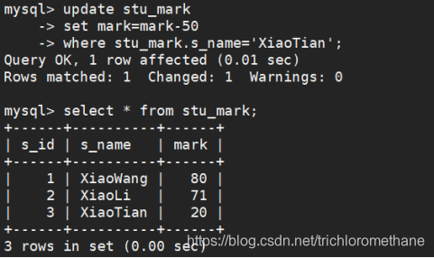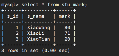 INSERT INTO stu_mark VALUES(1,'XiaoWang',80),(2,'XiaoLi',71),(3,'XiaoTian',70);