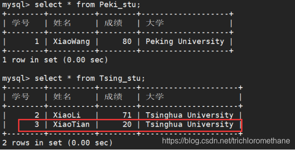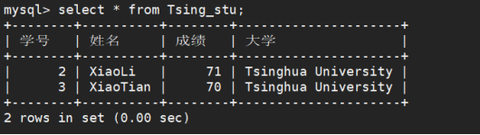 create view Tsing_stu(学号,姓名,成绩,大学) as
