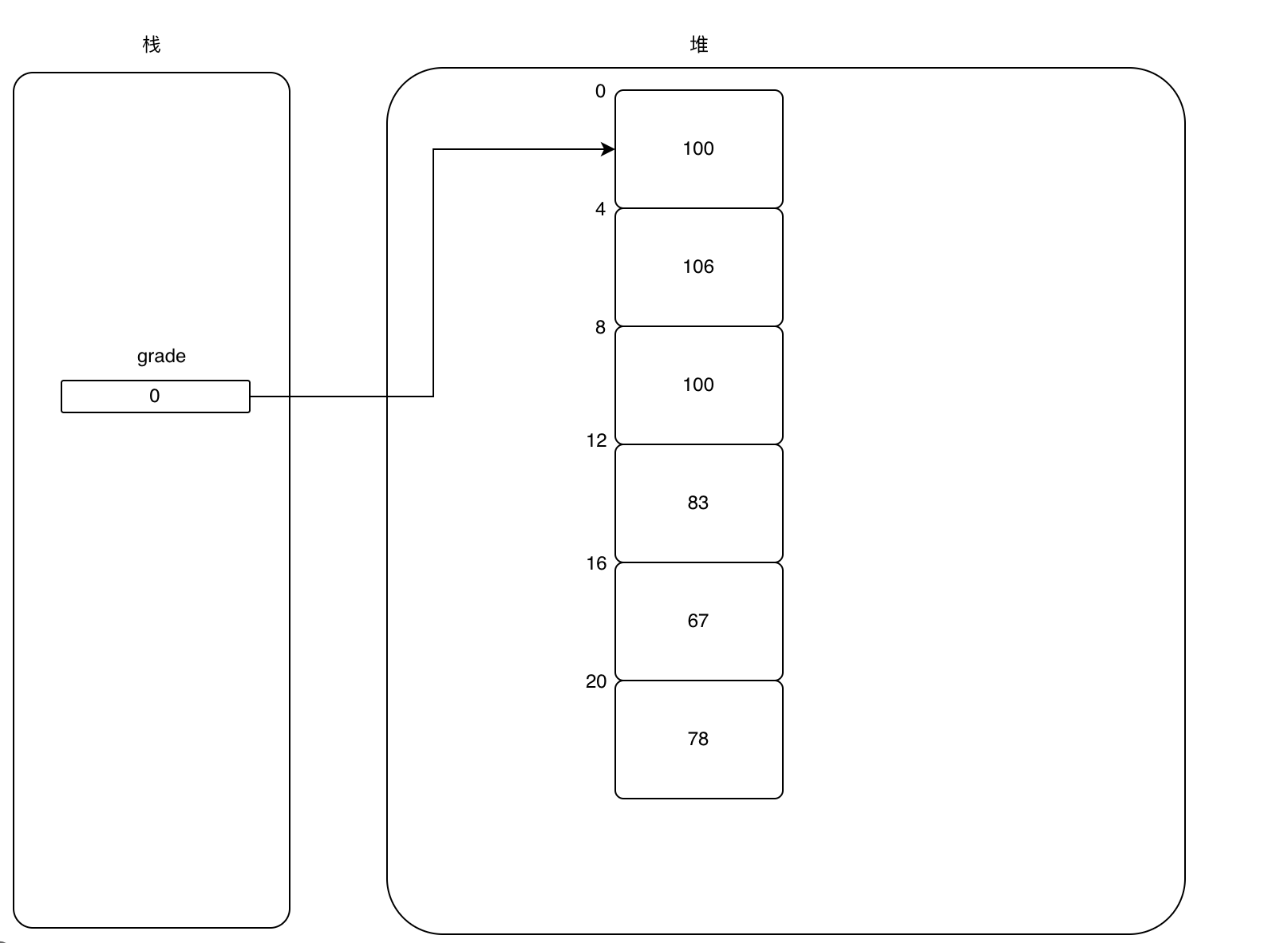 - 第二,数组是怎样通过下标进行访问元素的?在 C 语言中,指针指向的是一个内存地址。在这里,数组名 grade 是一个指针,存储着该数组的起始地址 0(即为基地址),再通过基地址进行访问其他数据的存储地址,由于内存地址是连续的,并且存储空间大小一致,下标访问就是基于地址的有序增加实现的。