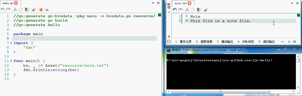 注释部分即描述了三个动作,完成资源文件代码生成,编译与运行命令,当执行 go generate 时,三条命令执行下来运行的结果为显示 note.txt 中的文本内容。运行效果如下,当修改了 note.txt,执行 go generate,会自动完成重新生成代码,编译和运行。