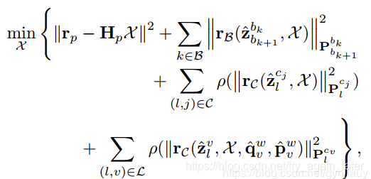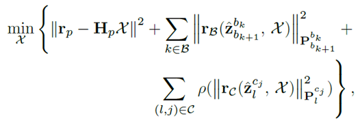 S是所有顺序边的集合,L是回环边的集合。尽管紧耦合的重定位已经有助于消除错误的回环,但我们添加了另一个Huber范数 ρ(·),以进一步减少任何可能的错误回环的影响。相反,我们不对顺序边使用任何鲁棒范数,因为这些边是从VIO中提取出来的,VIO已经包含了足够多的外点排除机制。