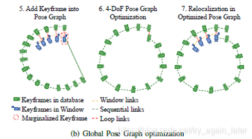 由于视觉-惯性 使得横滚角和俯仰角完全可以观测,因此只有(XYZ和yaw航向)4个自由度存在累积漂移。接下来只进行4-DOF的位姿图优化。