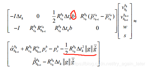 目标函数:相邻两帧IMU预积分增量与预测值之间平移、速度(P、V)的差。通过HX=B 利用cholesky分解获得