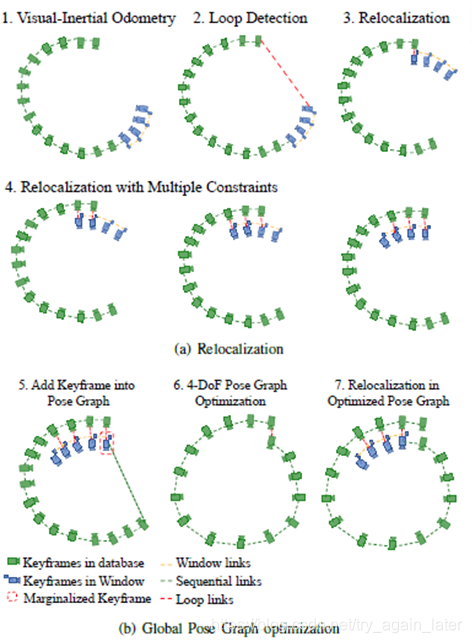 尽管滑动窗和边缘化减小了计算复杂度,但是仍旧引进了系统的累计漂移误差。具体来说,就是全局三维位置(xyz)和围绕重力方向的旋转(yaw)。作者采用紧耦合重定位模块与单目VIO进行组合实现漂移误差的消除。