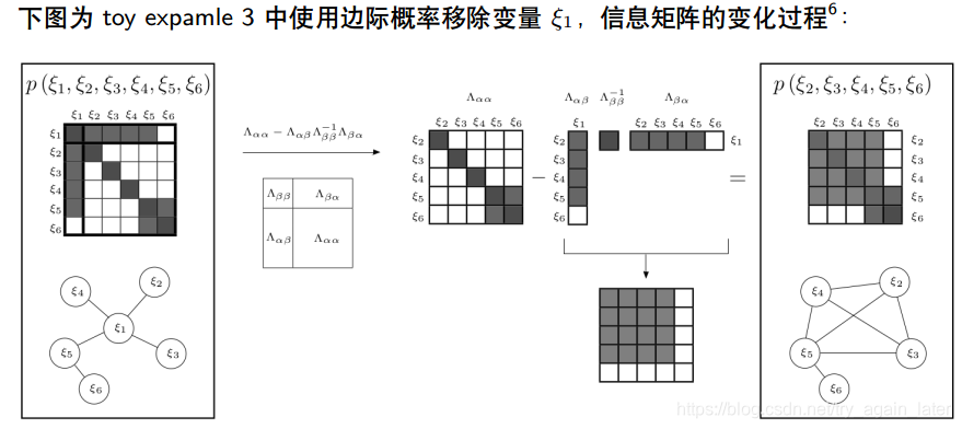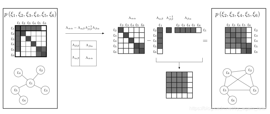 注意:去掉了x1,但是之前和x1相连的所有量x2 x3 x4 x5 在marg掉x1后变得两两相连。