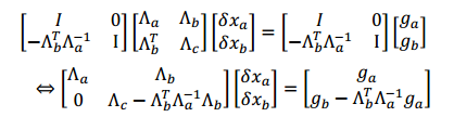 xa为需要marg的变量,假设为相机pose,我们更关心如何求解希望保留的xb,而不再求解xa(即marg的变量改为0,左乘时左上是0),这里是要变化为上三角。