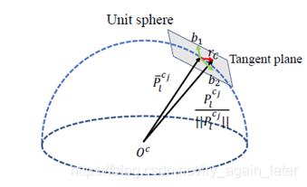 在相机的归一化平面上比较残差,再将视觉残差投影到单位球面的正切平面上。由于视觉残差的自由度是2,所以我们将残差向量投影到切平面上。