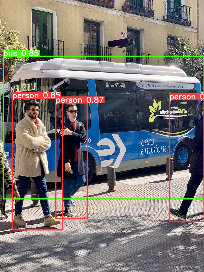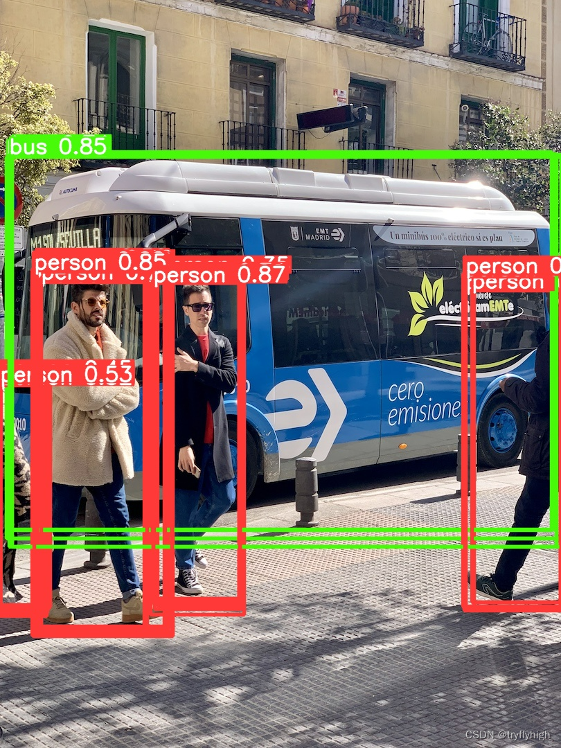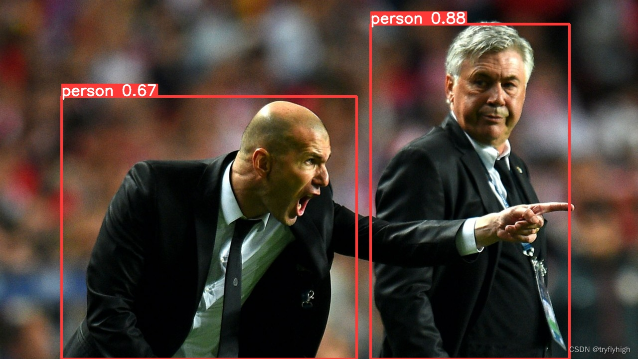 在IDE中打开下载好的 yolov5-7.0 文件夹,进入路径 D:\yolov5\yolov5-7.0\detect.py 下的py文件,直接在IDE上点击运行,最终会输出 D:\yolov5\yolov5-7.0\data\images 路径下两张图片的预测结果于 D:\yolov5\yolov5-7.0\runs\detect\exp 中,显示如下