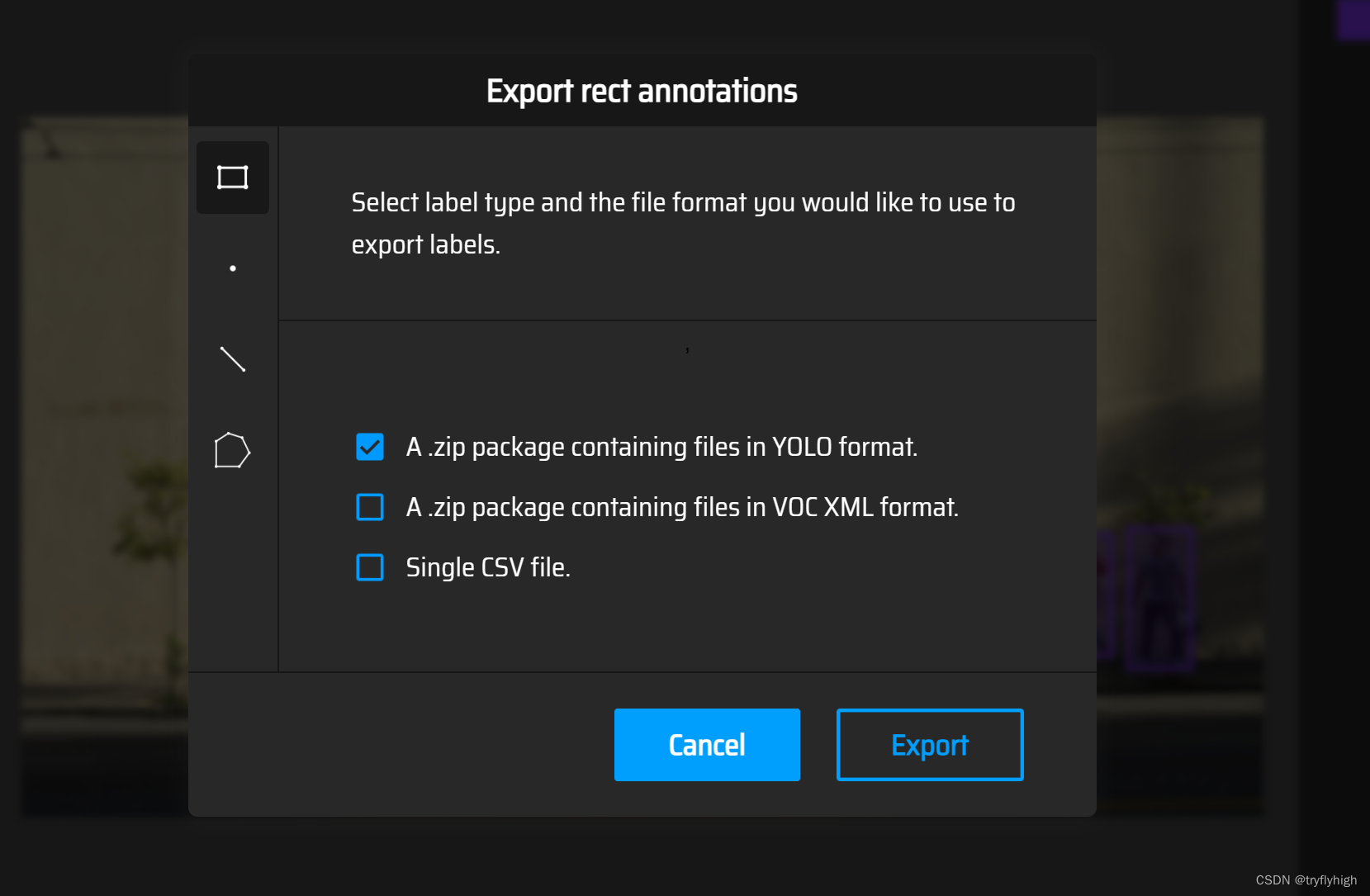 最后全部标注好后,将标注数据导出,如下选择 YOLO 模型数据形式