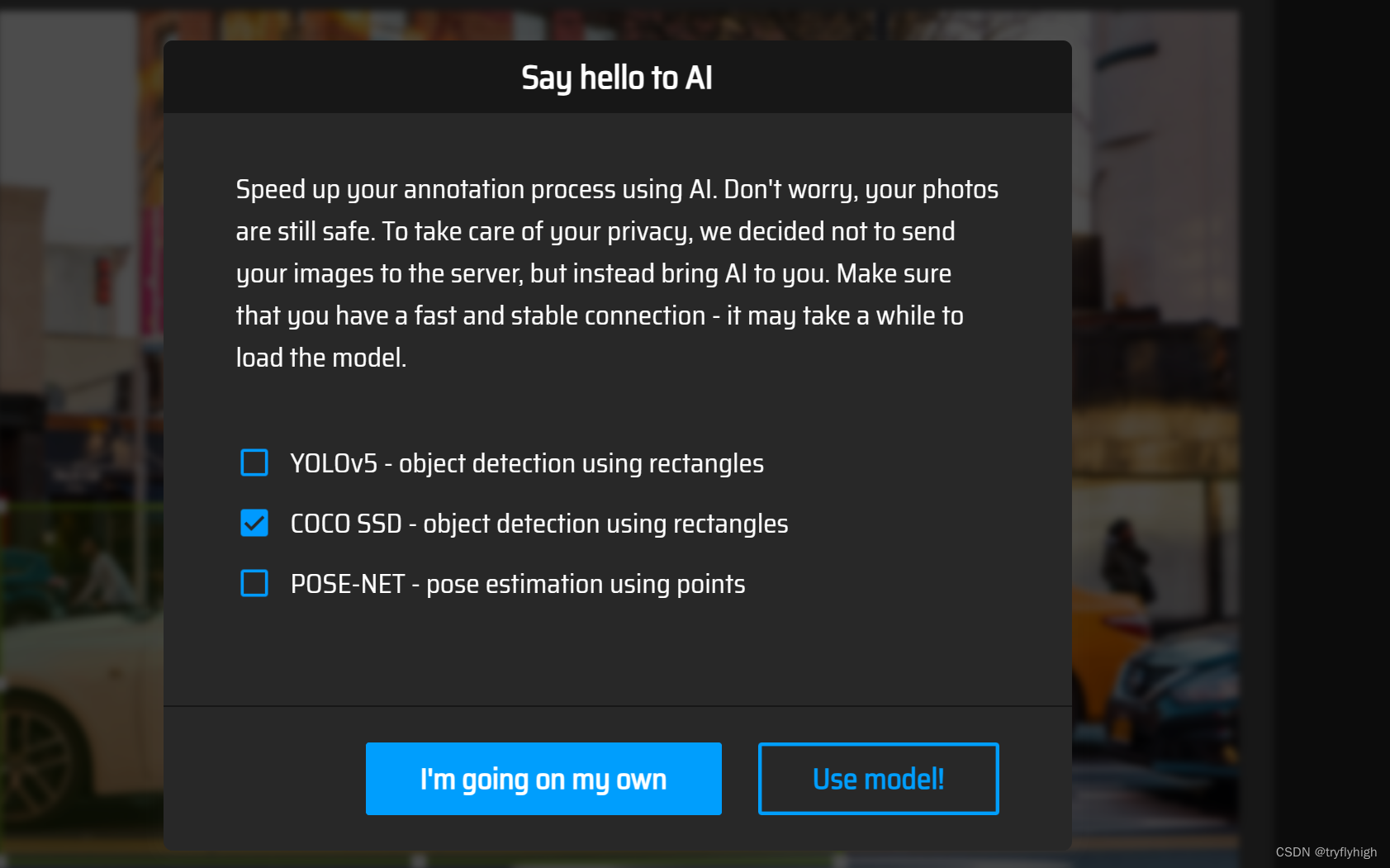 也可以选择 AI 模型进行自动标注,如下选择 COCO SSD 进行自动标注,标注好后选择添加