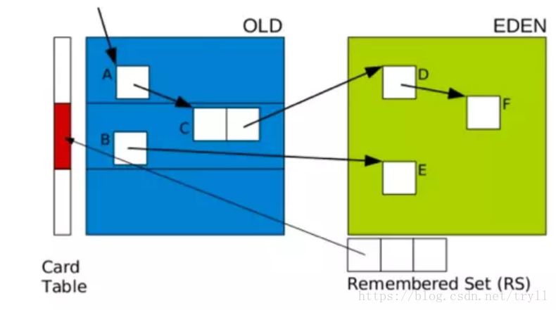 在CMS中,也有RSet的概念,在老年代中有一块区域用来记录指向新生代的引用。这是一种point-out,在进行Young GC时,扫描根时,仅仅需要扫描这一块区域,而不需要扫描整个老年代。