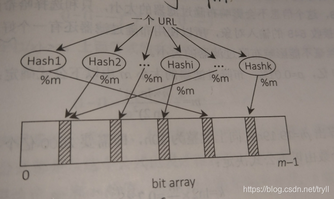 【BloomFilter】 假设具有一个长度为m的bit 数组,有k个哈希函数。这些函数的输出域S大于等于m。它们彼此之间独立,那么对于同一个输入对象URL再经过k个hash函数得到k个值,分别%m的结果映射到bit 数组的相应位置,把相应的位置涂黑,如下图所示: