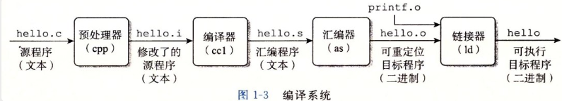 hello.c 程序在 Unix 系统上,由编译器把源文件转换为目标文件。