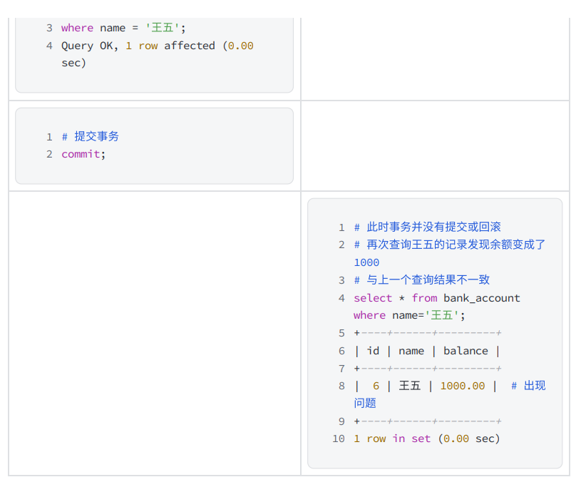 解决了脏读问题,这时事务只能读到了其 他事务提交之后的数据,但会出现不可重复读的问题,比如事务A先对某条数据进行了查询,之后事务 B对这条数据进行了修改,并且提交( COMMIT )事务,事务A再对这条数据进行查询时,得到了事务B 修改之后的结果,这导致了事务A在同⼀个事务中以相同的条件查询得到了不同的值,这个现象要"不可重复读"。