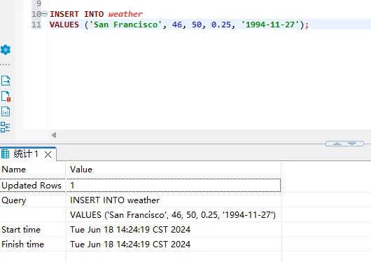 VALUES ('San Francisco', 46, 50, 0.25, '1994-11-27');