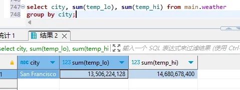 select city, sum(temp_lo), sum(temp_hi) from main.weather