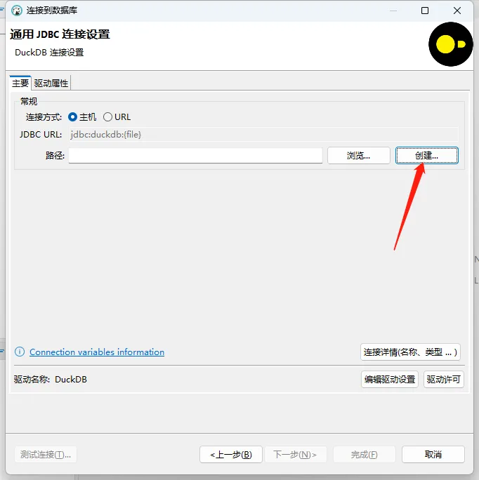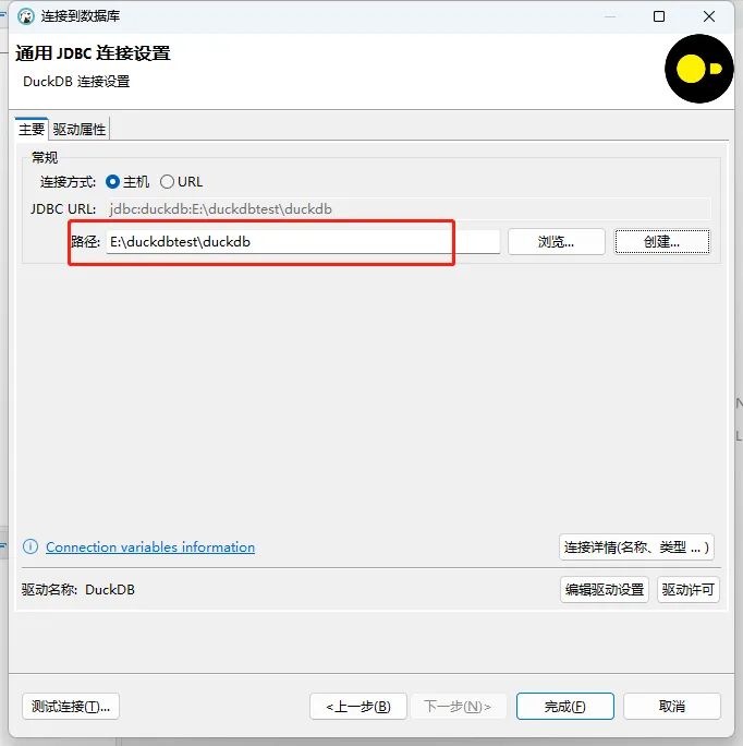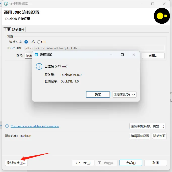 当弹出已连接,确认,点击完成,就已经可以使用DuckDB了。