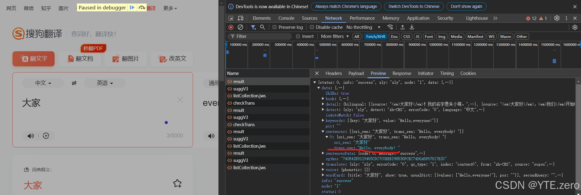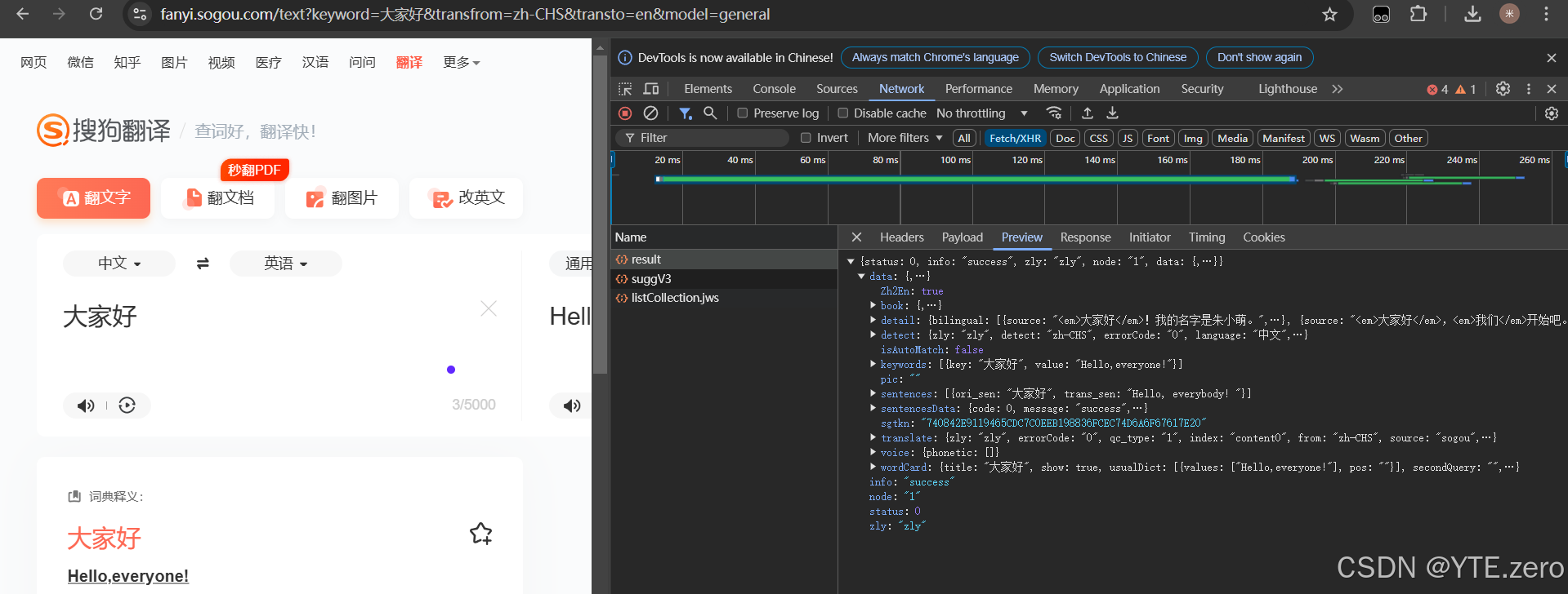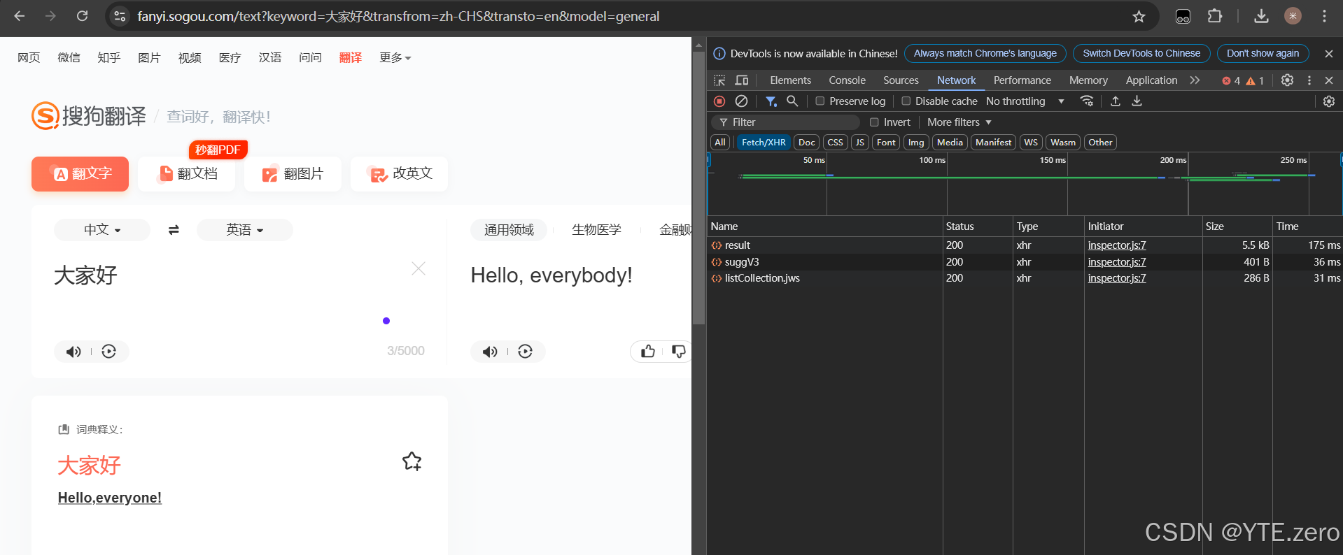 我们需要对网页的资源需要一定的了解,以及定位。首先我们打开搜狗翻译的网页版,打开开发者工具,首先需要做的就是