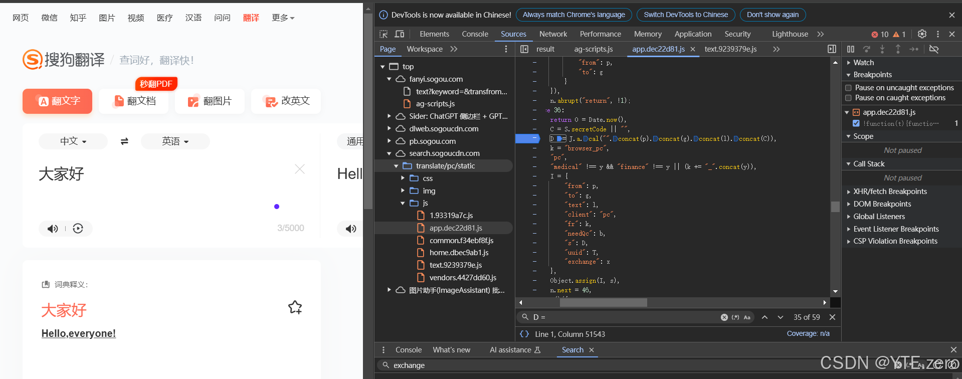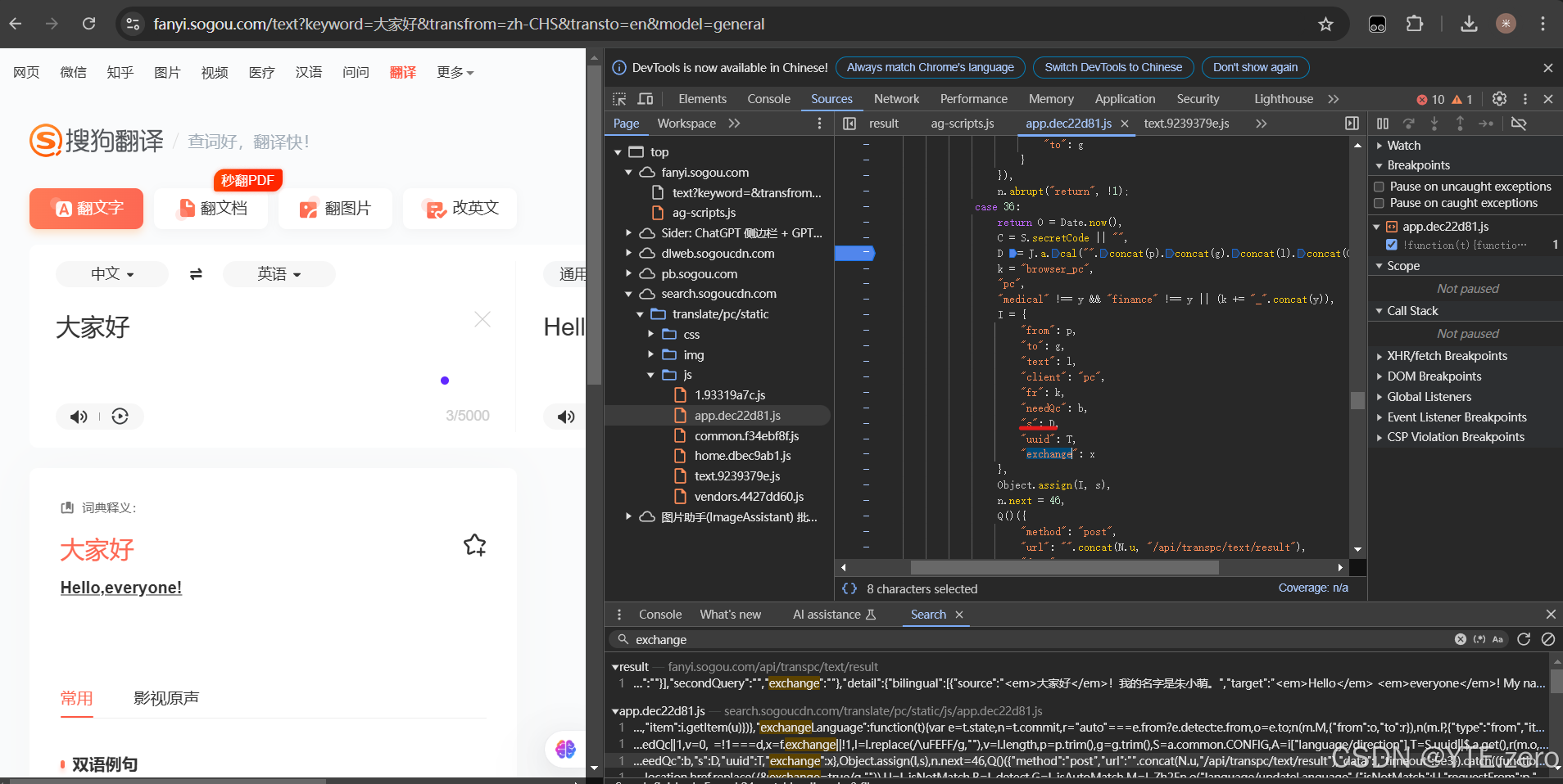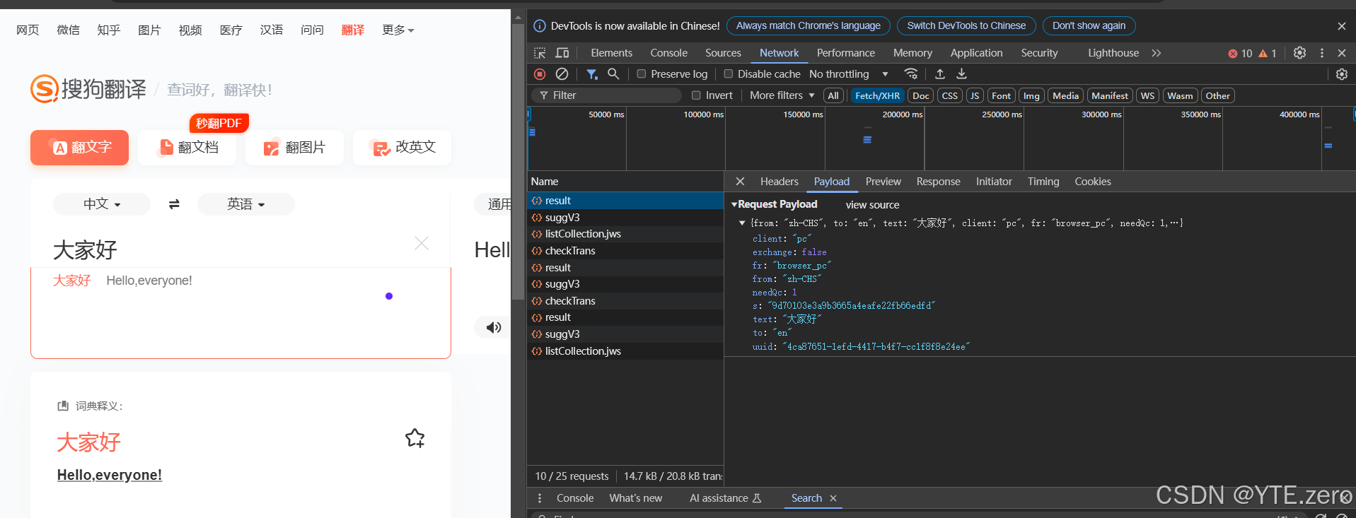 我们需要对网页的资源需要一定的了解,以及定位。首先我们打开搜狗翻译的网页版,打开开发者工具,首先需要做的就是