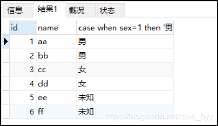 select id,name,case when sex=1 then '男' when sex=2 then '女' else '未知' end from stu;