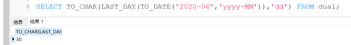 SELECT TO_CHAR(LAST_DAY(TO_DATE('2020-06','yyyy-MM')),'dd') FROM dual;