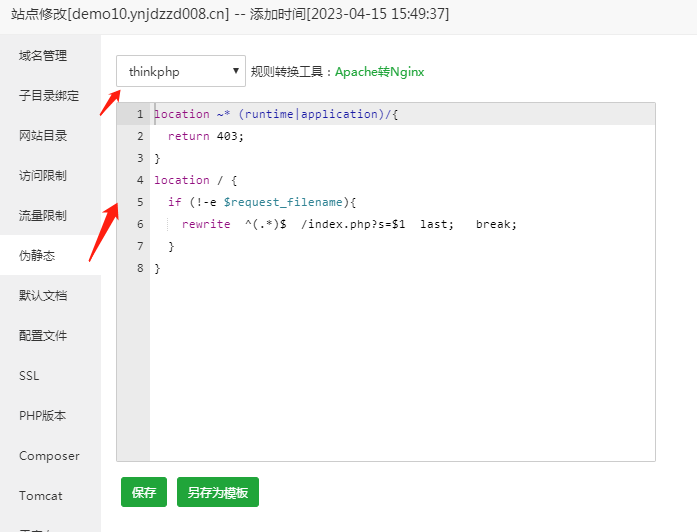 2、PHP伪静态规则选择thinkphp ,对照下图
