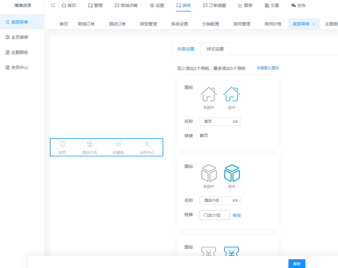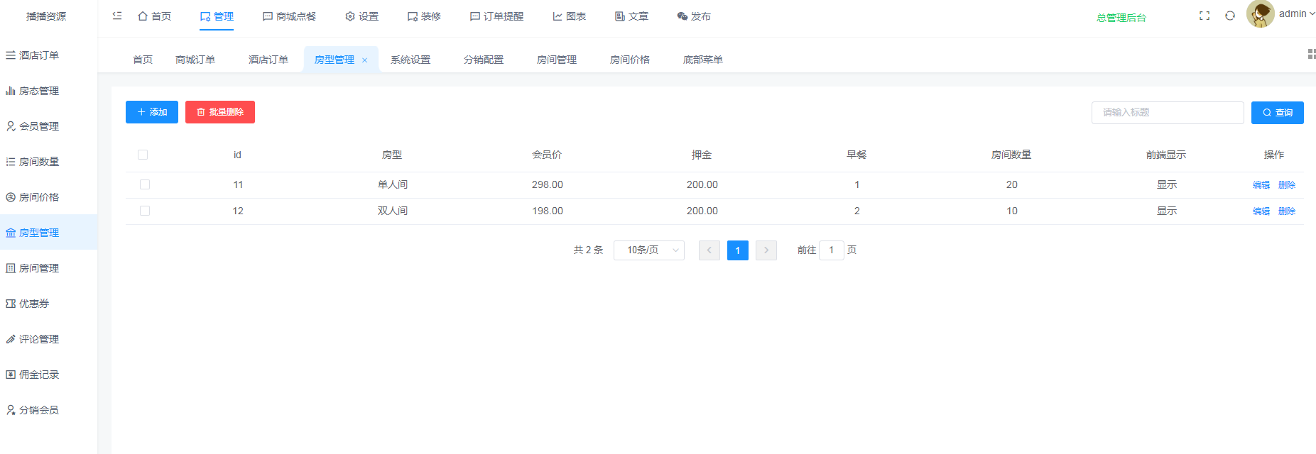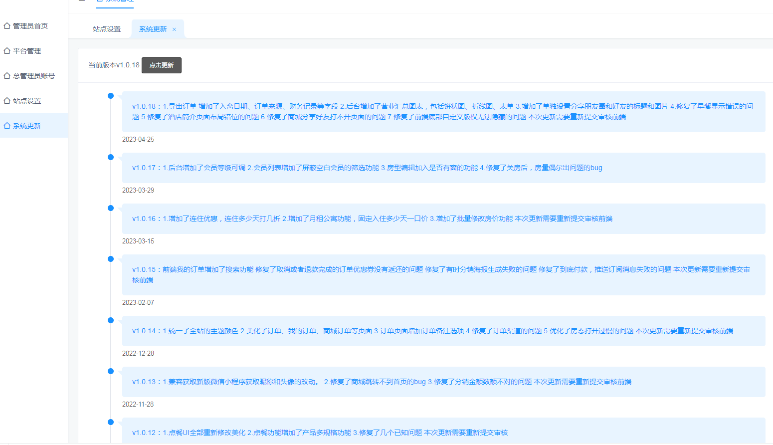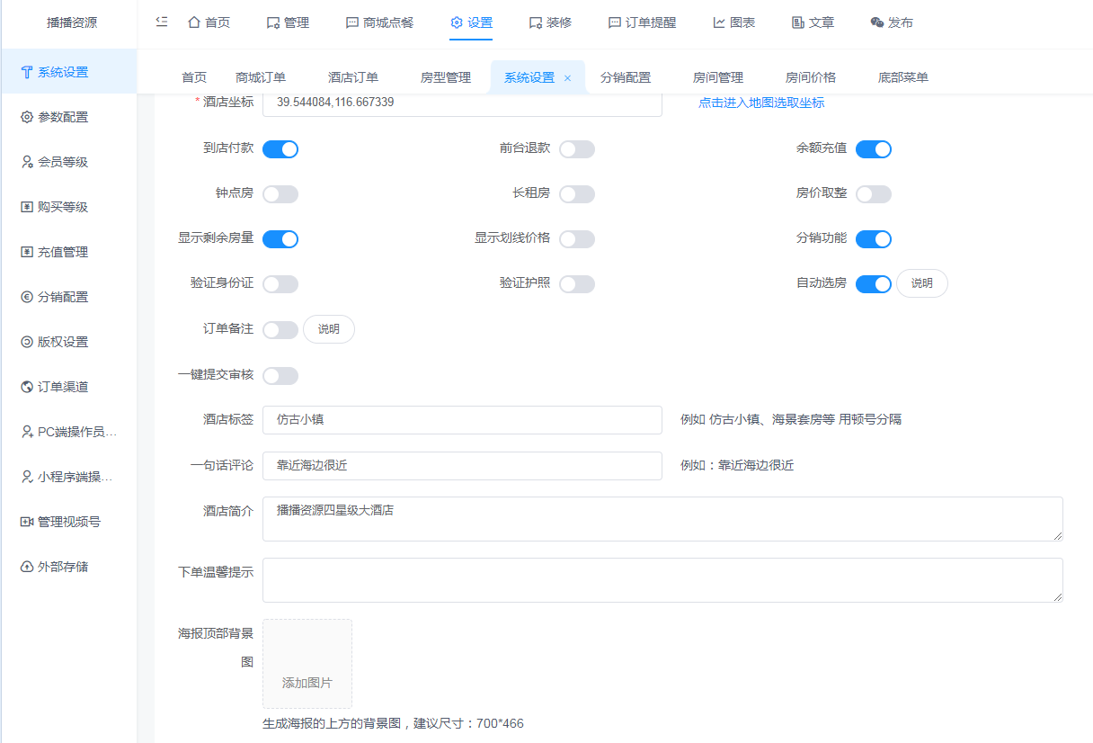 手边酒店原来微擎模块版使用过,目前提供的版本是独立版的,播播资源总体体验了一下功能还是强大,非常合适酒店及民宿类小程序搭建。小程序端只支持单店版,不支持平台入驻。系统支持无限多开小程序。播播资源后台体验后支持视频号对接、二级分销、会员等级、酒店点餐、首页DIY装修、订单短信邮件消息几种方式提醒、营业汇总、文章营销,基本上能满足这行业的需求了,系统最大优势提供了在线升级,无需授权,小程序端用户授权也是采用最新接口,可随时享受同步使用官方最新版本。