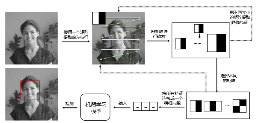 步骤:用一个矩阵扫描图像,缩放矩阵大小再次扫描图像,使用不同的矩阵来扫描图像。将得到的所有哈尔特征值连成特征向量。