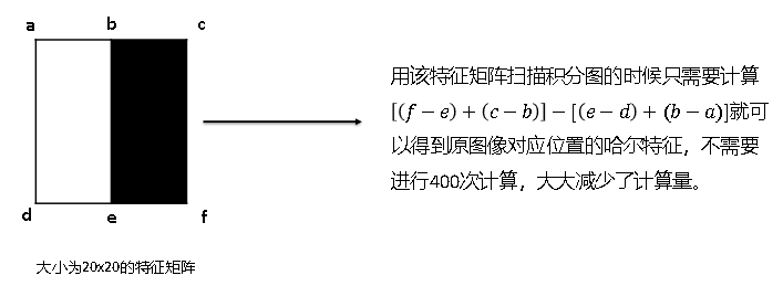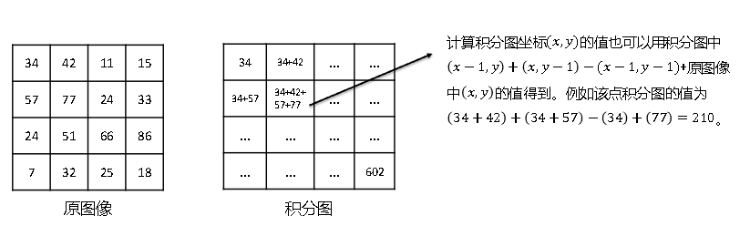 啥是积分图呢,理解起来也很简单,就是将各像素的灰度值累积起来将其放入一个新的积分图里。积分图的长和宽与原图像一致,积分图某一点(x,y)的值等于这个点(x,y)在原图像包含的所有的像素灰度值的累积加和。当使用特征矩阵进行计算是可以直接使用积分图进行计算,不需要重新累加向量和,从而加快了计算。
