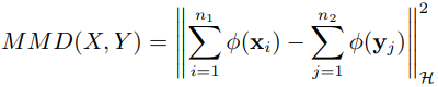 最大均值差异是迁移学习中使用频率最高的度量。Maximum mean discrepancy,它度量在再生希尔伯特空间中两个分布的距离,是一种核学习方法。两个随机变量的距离为: