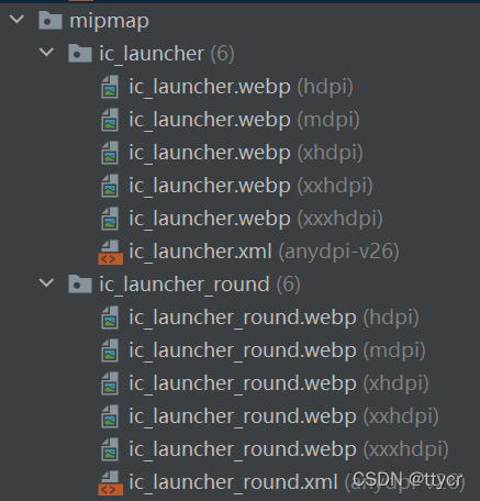 mipmap-xxxhdpi(超超超高)、mipmap-xxhdpi(超超高)、mipmap-xhdpi(超高)、mipmap-hdpi(高)、mipmap-mdpi(中)5个目录,分别用来存放超超超高分辨率图片、超超高分辨率图片、超高分辨率图片、高分辨率图片和中分辨率图片。