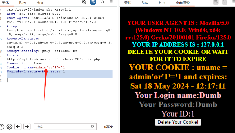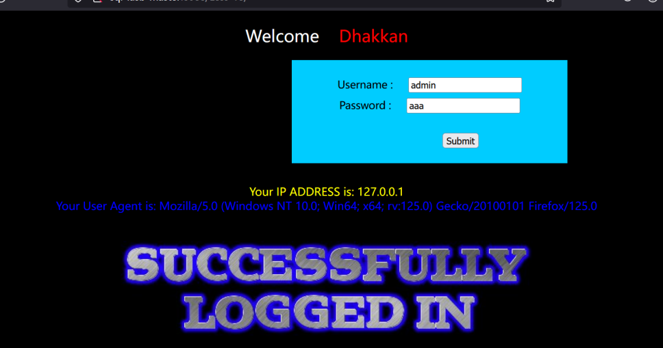 首先我们注入正确的用户名和密码,观察到网页回显Your User Agent is: Mozilla/5.0 (Windows NT 10.0; Win64; x64; rv:125.0) Gecko/20100101 Firefox/125.0