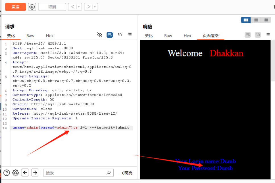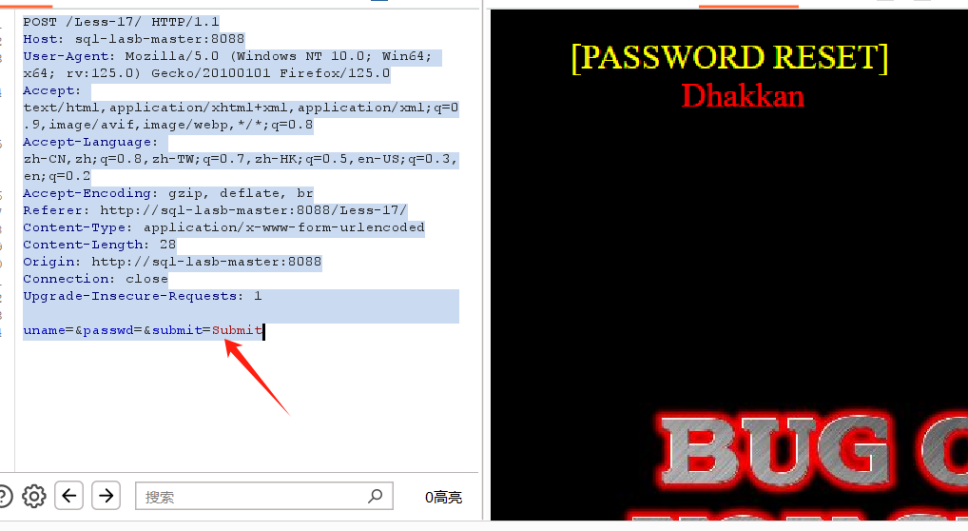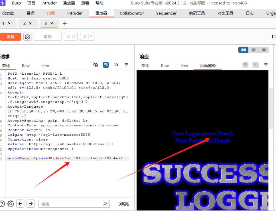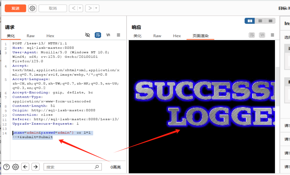还是同上一关一样,登陆靶场然后把抓到的包发送到重放器中。