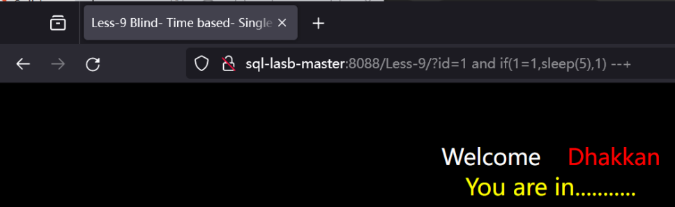 - 当使用了?id=1' and if(1=1,sleep(5),1) --+ 时,发现了网页反应的速度变慢了,所以存在的闭合为单引号。