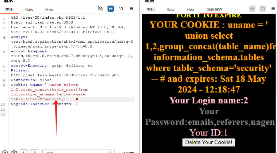 - 在cookie 处使用‘or’1’=1='1 判断注入点