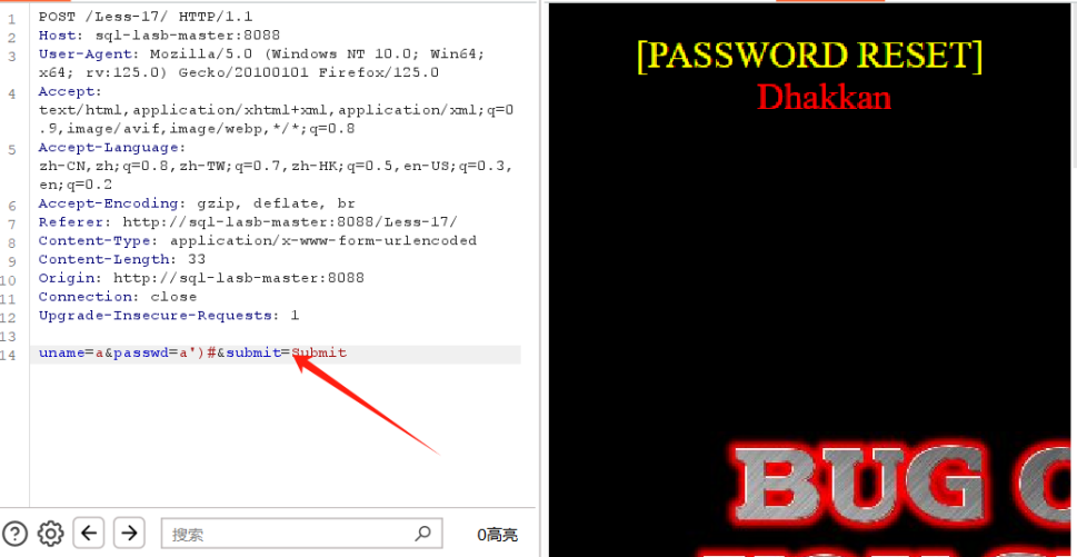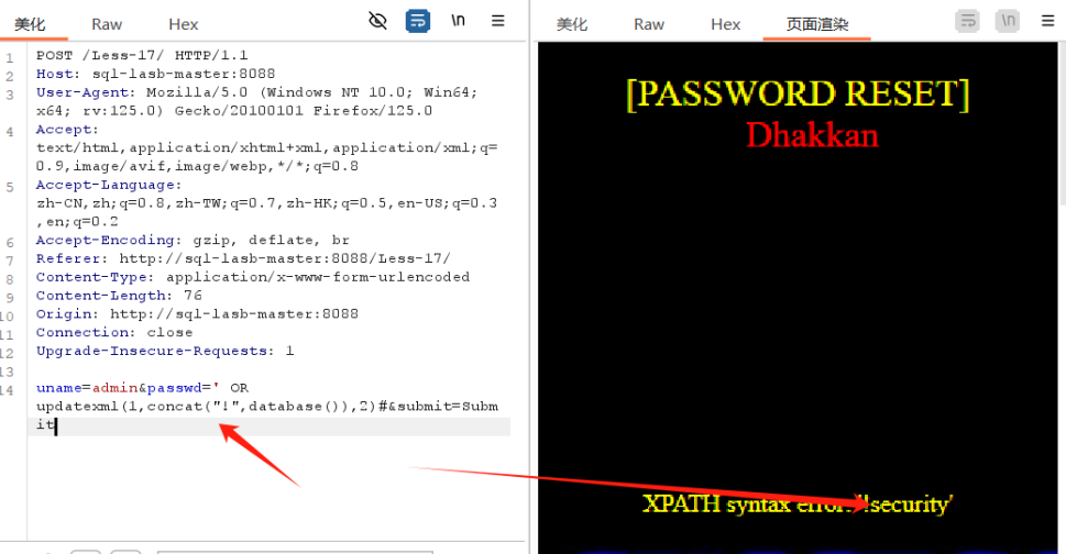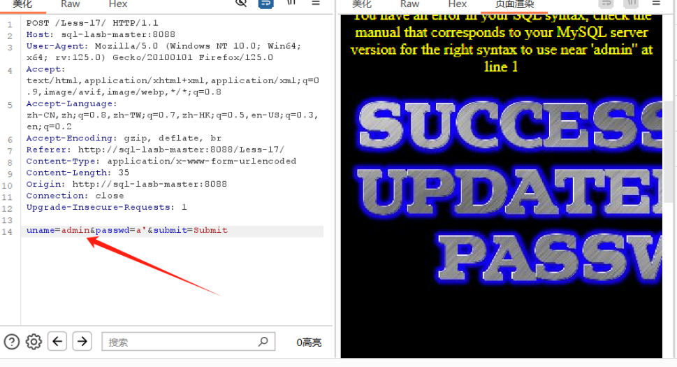 先打开less-17靶场,输入用户密码,跳出来了要更新账户的界面,其实是更新admin密码的操作,接下来输入一个新的密码即可。