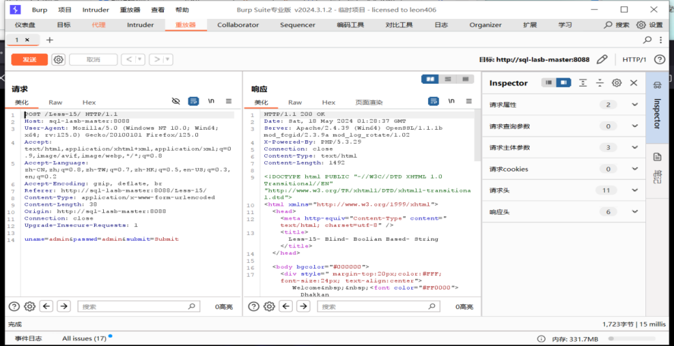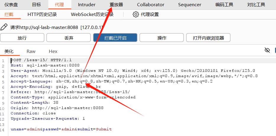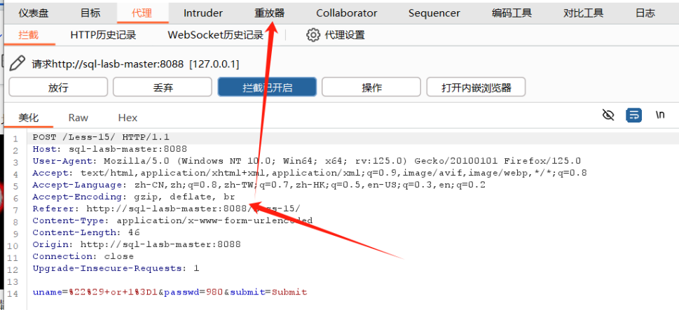 1,打开数据包拦截工具开启拦截,访问less-15靶场,把抓到的数据包右击发送到重放器中。
